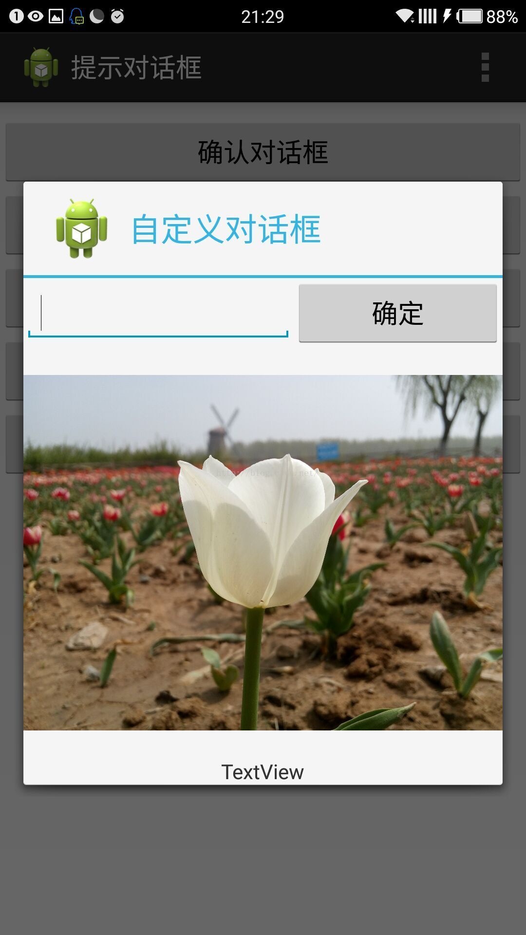 <?xml version="1.0" encoding="utf-8"?> <LinearLayout xmlns:android="http://schemas.android.com/apk/res/android" android:layout_width="wrap_content" android:layout_height="wrap_content" android:orientation="vertical" > <LinearLayout android:layout_width="match_parent" android:layout_height="wrap_content" android:orientation="horizontal" > <EditText android:id="@+id/edInput" android:layout_width="wrap_content" android:layout_height="wrap_content" android:layout_weight="2" > <requestFocus /> </EditText> <Button android:id="@+id/btnOk" android:layout_width="wrap_content" android:layout_height="wrap_content" android:layout_weight="1" android:text="确定" /> </LinearLayout> <ImageView android:id="@+id/ivPicture" android:layout_width="wrap_content" android:layout_height="280dp" android:src="@drawable/white" /> <TextView android:id="@+id/textView1" android:layout_gravity="center" android:layout_width="wrap_content" android:layout_height="wrap_content" android:text="TextView" /> </LinearLayout>3.MainActivity.java页面处理对话框的弹出及点击事件。