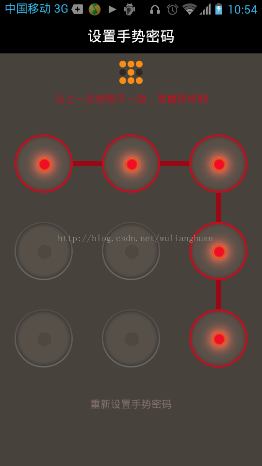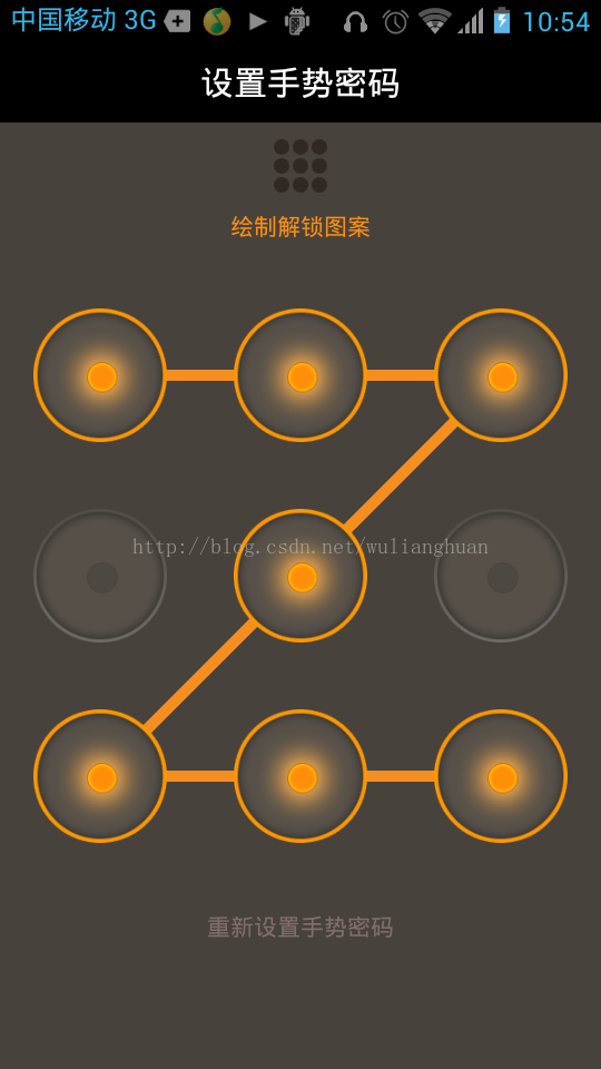 图2:设置手势密码 【监听手势的输入,TouchEvent的事件处理,获取输入的手势密码,同时显示在上方的提示区域】