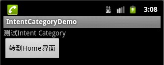 package com.android.category.activity;import android.app.Activity;import android.content.Intent;import android.os.Bundle;import android.view.View;import android.view.View.OnClickListener;import android.widget.Button;public class MainActivity extends Activity {private Button btn;@Overridepublic void onCreate(Bundle savedInstanceState) {super.onCreate(savedInstanceState);setContentView(R.layout.main);btn = (Button)findViewById(R.id.Button);btn.setOnClickListener(new OnClickListener() { @Override public void onClick(View v) { Intent intent = new Intent();intent.setAction(Intent.ACTION_MAIN);// 添加Action属性 intent.addCategory(Intent.CATEGORY_HOME);// 添加Category属性 startActivity(intent);// 启动Activity }});}} 效果图如下: