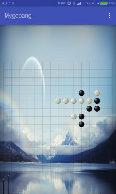 public class MainActivity extends AppCompatActivity { private ChessBoardView chessBoardView; @Override protected void onCreate(Bundle savedInstanceState) {super.onCreate(savedInstanceState);setContentView(R.layout.activity_main);chessBoardView = (ChessBoardView) findViewById(R.id.boardView); } @Override public boolean onOptionsItemSelected(MenuItem item) {int id = item.getItemId();// 再来一局if (id == R.id.action_setting) { chessBoardView.start(); return true;}return super.onOptionsItemSelected(item); } @Override public boolean onCreateOptionsMenu(Menu menu) {getMenuInflater().inflate(R.menu.menu_main, menu);return true; }}2、常量类便于维护管理:Constantspublic class Constants { // 五子连珠 public final static int MAX_COUNT_IN_LINE = 5; // 棋盘的行数 final static int MAX_LINE = 15; // 检查的方向 final static int HORIZONTAL = 0; final static int VERTICAL = 1; final static int LEFT_DIAGONAL = 2; final static int RIGHT_DIAGONAL = 4;}3、activity_main.xml中增加了自定义棋盘的View:<?xml version="1.0" encoding="utf-8"?><RelativeLayout xmlns:android="http://schemas.android.com/apk/res/android" xmlns:tools="http://schemas.android.com/tools" android:layout_width="match_parent" android:layout_height="match_parent" android:background="@mipmap/bg" tools:context="com.example.linux.mygobang.MainActivity"> <com.example.linux.mygobang.ChessBoardViewandroid:id="@+id/boardView"android:layout_centerInParent="true"android:layout_width="match_parent"android:layout_height="match_parent" /></RelativeLayout>4、menu_main.xml中定义再来一局的菜单: