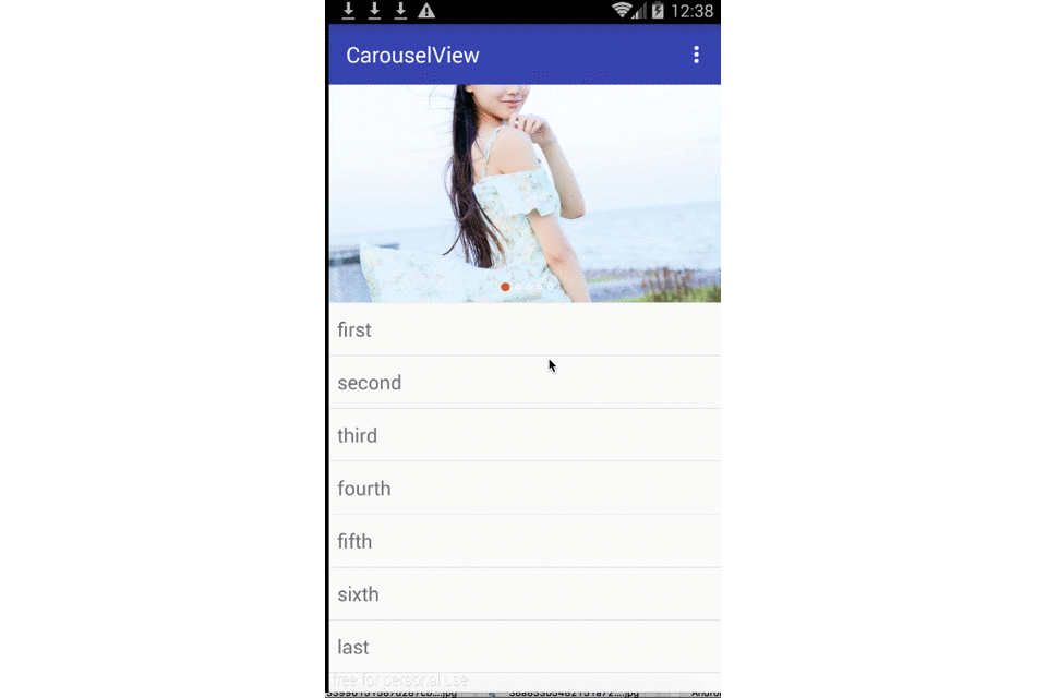 CarouselView carouselView = (CarouselView) findViewById(R.id.CarouselView);carouselView.setAdapter(new CarouselView.Adapter() { @Override public boolean isEmpty() {return false; } @Override public View getView(int position) {View view = mInflater.inflate(R.layout.item,null);ImageView imageView = (ImageView) view.findViewById(R.id.image);imageView.setImageResource(mImagesSrc[position]);return view; } @Override public int getCount() {return mImagesSrc.length; }});返回是否为空,在getView(int position)中return我们想返回的View,就是这么简单了啦。