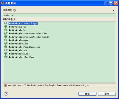 4) 注册创建的activity到AndroidManifest.xml运用eclisps可以可视化添加,双击AndroidManifest.xml 选择标签application->add->activity ,输入刚才创建 的类名。