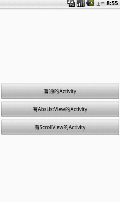 <LinearLayout xmlns:android="http://schemas.android.com/apk/res/android" xmlns:tools="http://schemas.android.com/tools" android:layout_width="match_parent" android:layout_height="match_parent" android:gravity="center" android:orientation="vertical" ><Button android:id="@+id/normal_activity" android:layout_width="match_parent" android:layout_height="wrap_content" android:text="普通的Activity" /><Button android:id="@+id/absListview_activity" android:layout_width="match_parent" android:layout_height="wrap_content" android:text="有AbsListView的Activity" /><Button android:id="@+id/scrollview_activity" android:layout_width="match_parent" android:layout_height="wrap_content" android:text="有ScrollView的Activity" /></LinearLayout>