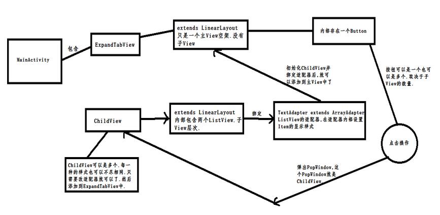 /** * @param textArray: ListView中item对应的text值的集合.. * @param viewArray: 当前Layout中需要加入的View..* */@SuppressLint("ResourceAsColor") public void setValue(ArrayList<String> textArray, ArrayList<View> viewArray) {if (mContext == null) {return;}LayoutInflater inflater = (LayoutInflater) mContext.getSystemService(Context.LAYOUT_INFLATER_SERVICE);mTextList = textArray;for (int i = 0; i < viewArray.size(); i++) {//这里就添加了一个View..final RelativeLayout r = new RelativeLayout(mContext);int maxHeight = (int) (displayHeight * 0.5);//定义布局的高度..RelativeLayout.LayoutParams rl = new RelativeLayout.LayoutParams(RelativeLayout.LayoutParams.MATCH_PARENT, maxHeight);r.addView(viewArray.get(i), rl); //在布局中添加View并指定参数mViewList.add(r);r.setTag(SMALL);//定义最上方的按钮,并在布局中添加这个按钮。并设置按钮的textToggleButton tButton = (ToggleButton) inflater.inflate(R.layout.toggle_button, this, false);addView(tButton);mToggleList.add(tButton);tButton.setTag(i);tButton.setText(mTextList.get(i));//用于实现当PopWindow显示时.再次点击收回PopWindowr.setOnClickListener(new OnClickListener() {@Overridepublic void onClick(View v) {onPressBack();}});r.setBackgroundColor(mContext.getResources().getColor(R.color.popup_main_background));//当按钮被点击后需要触发的监听tButton.setOnClickListener(new OnClickListener() {@Overridepublic void onClick(View view) {ToggleButton tButton = (ToggleButton) view;/** 如果当前点击的按钮与上次的点击不同.则设置当前的按钮处于点击状态 */if (selectedButton != null && selectedButton != tButton) {selectedButton.setChecked(false);}selectedButton = tButton;selectPosition = (Integer) selectedButton.getTag();/** 按钮被点击后,需要触发对应的监听事件.*/startAnimation();if (mOnButtonClickListener != null && tButton.isChecked()) {mOnButtonClickListener.onClick(selectPosition);}}});}} 那么设置完了布局的样式后..只有一个ToggleButton按钮.点击后没有任何的效果.我们需要去定义一个新的View视图.用于点击按钮后需要显示的弹出窗.那么这个弹出窗也需要自定义..package com.example.view;import java.util.ArrayList;import java.util.LinkedList;import android.content.Context;import android.util.AttributeSet;import android.util.SparseArray;import android.view.LayoutInflater;import android.view.View;import android.widget.LinearLayout;import android.widget.ListView;import com.example.adapter.TextAdapter;import com.example.expandtabview.R;public class ChildView extends LinearLayout {private ListView regionListView;//主ListViewprivate ListView plateListView;//子ListView//主ListView每一个Item对应的textprivate String LeftFaString[] = new String[] { "美食", "快餐小吃", "火锅", "海鲜/烧烤","特色菜", "香锅/烤鱼", "地方菜", "东南亚菜", "西餐", "日韩料理" };//子ListView每一个Item对应的text..采用了二维数组的实现方式..private String LeftCh1String[][] = new String[][] {{ "全部" },{ "全部", "中式简餐", "地方小吃", "盖浇饭", "米粉米线", "面馆", "麻辣烫", "黄焖鸡米饭","鸭脖卤味", "饺子馄饨", "炸鸡炸串", "包子/粥", "零食", "生煎锅贴", "冒菜" },{ "全部", "其他火锅" }, { "全部", "小龙虾" }, { "全部" }, { "全部", "香锅", "烤鱼" },{ "全部", "鲁菜", "川菜", "其他" }, { "全部" },{ "全部", "意面披萨", "西式快餐", "其他西餐" }, { "全部", "韩式简餐", "韩国料理" } };//添加主ListView中的数据信息private ArrayList<String> groups = new ArrayList<String>();//添加子ListView中的数据信息private LinkedList<String> childrenItem = new LinkedList<String>();//稀疏数组private SparseArray<LinkedList<String>> children = new SparseArray<LinkedList<String>>();//为ListView设置适配器private TextAdapter plateListViewAdapter;private TextAdapter earaListViewAdapter;//监听事件的设置private OnSelectListener mOnSelectListener;private int tEaraPosition = 0; //用于保存当前主ListView被点击的Item对应的Position.private int tBlockPosition = 0;//用于保存当前子ListView被点击的Item对应的Position.private String showString = "";public ChildView(Context context) {super(context);init(context);}public ChildView(Context context, AttributeSet attrs) {super(context, attrs);init(context);}private void init(Context context) {LayoutInflater inflater = (LayoutInflater) context.getSystemService(Context.LAYOUT_INFLATER_SERVICE);//加载布局,绑定ID.inflater.inflate(R.layout.view_region, this, true);regionListView = (ListView) findViewById(R.id.listView);plateListView = (ListView) findViewById(R.id.listView2);//初始化ListView中每一个item对应的textfor(int i=0;i<10;i++){groups.add(LeftFaString[i]);LinkedList<String> tItem = new LinkedList<String>();for(int j=0;j<LeftCh1String[i].length;j++){tItem.add(LeftCh1String[i][j]);}children.put(i, tItem);}//主ListView列表项的适配器earaListViewAdapter = new TextAdapter(context, groups,R.drawable.choose,R.drawable.choose_eara_item_selector);earaListViewAdapter.setTextSize(12);earaListViewAdapter.setSelectedPositionNoNotify(tEaraPosition);regionListView.setAdapter(earaListViewAdapter);earaListViewAdapter.setOnItemClickListener(new TextAdapter.OnItemClickListener() {@Overridepublic void onItemClick(View view, int position) {if (position < children.size()) {childrenItem.clear();//获取这一页的所有数据信息..然后唤醒适配器更新数据childrenItem.addAll(children.get(position));plateListViewAdapter.notifyDataSetChanged();}}});if (tEaraPosition < children.size())childrenItem.addAll(children.get(tEaraPosition));//子ListView的适配器plateListViewAdapter = new TextAdapter(context, childrenItem,R.drawable.choose_item_right,R.drawable.choose_plate_item_selector);plateListViewAdapter.setTextSize(12);plateListViewAdapter.setSelectedPositionNoNotify(tBlockPosition);plateListView