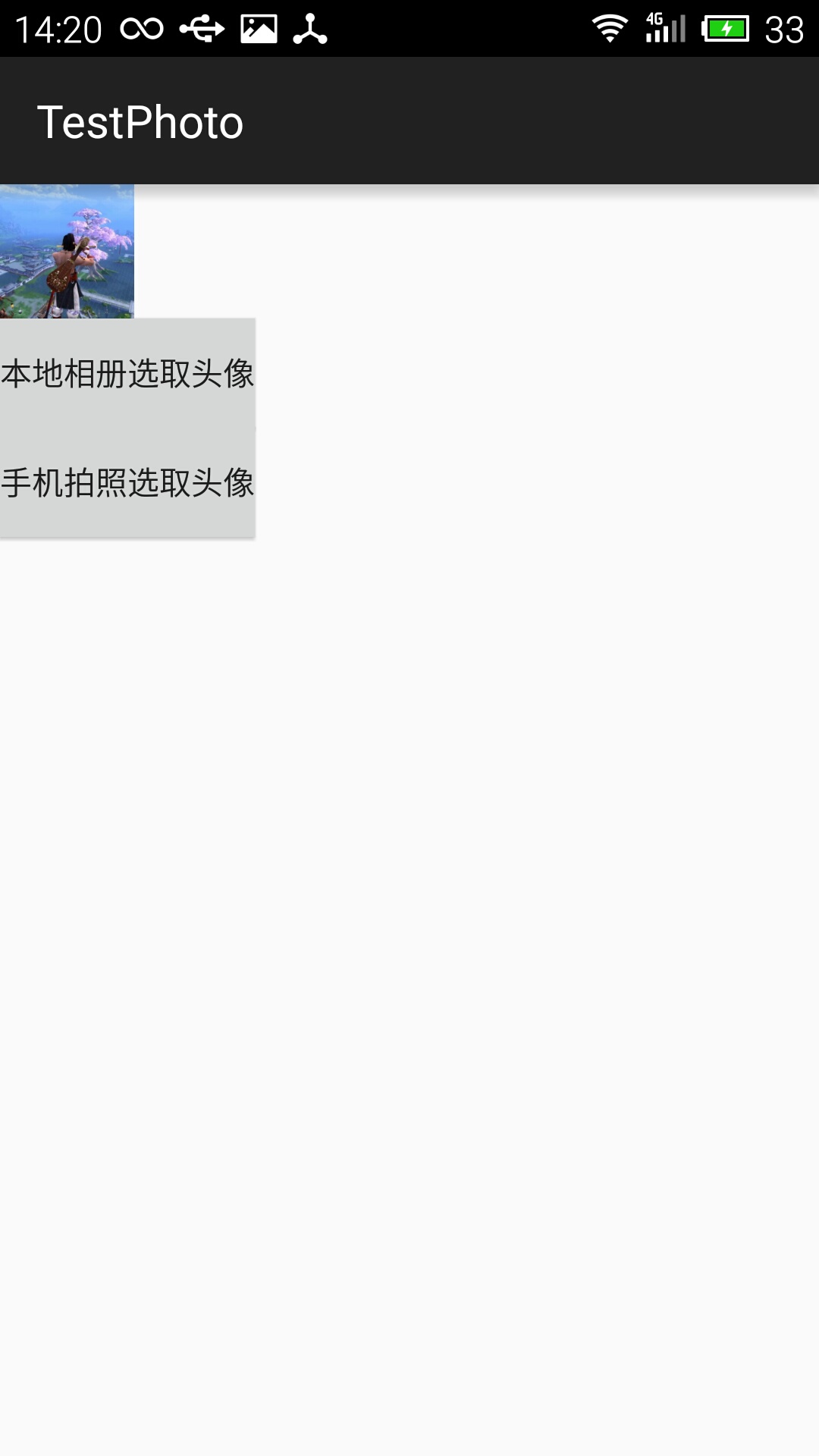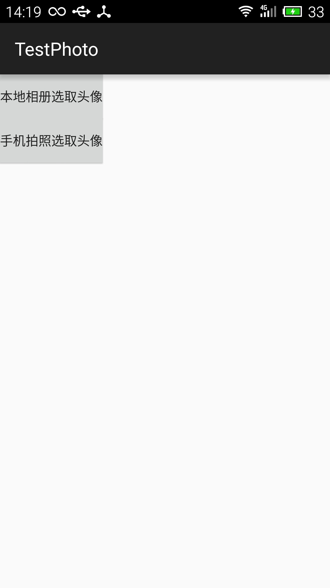 <LinearLayout xmlns:android="http://schemas.android.com/apk/res/android"android:layout_width="match_parent"android:layout_height="match_parent"android:orientation="vertical" ><ImageViewandroid:id="@+id/imageView"android:layout_width="wrap_content"android:layout_height="wrap_content"/><Buttonandroid:id="@+id/buttonLocal"android:layout_width="wrap_content"android:layout_height="wrap_content"android:text="本地相册选取头像" /><Buttonandroid:id="@+id/buttonCamera"android:layout_width="wrap_content"android:layout_height="wrap_content"android:text="手机拍照选取头像" /></LinearLayout>正文代码: