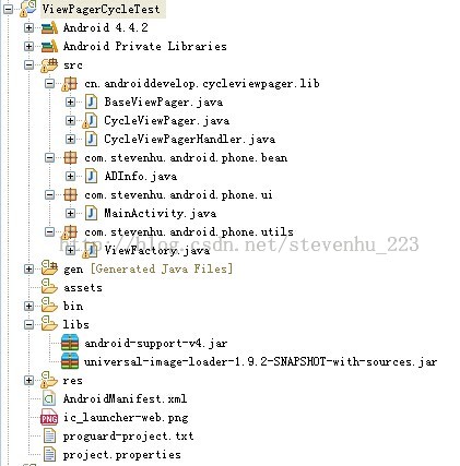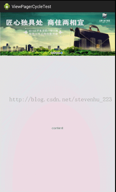 package com.stevenhu.android.phone.ui; import java.util.ArrayList; import java.util.List; import com.nostra13.universalimageloader.cache.disc.naming.Md5FileNameGenerator; import com.nostra13.universalimageloader.core.DisplayImageOptions; import com.nostra13.universalimageloader.core.ImageLoader; import com.nostra13.universalimageloader.core.ImageLoaderConfiguration; import com.nostra13.universalimageloader.core.assist.QueueProcessingType; import com.stevenhu.android.phone.bean.ADInfo; import com.stevenhu.android.phone.utils.ViewFactory; import android.annotation.SuppressLint; import android.app.Activity; import android.os.Bundle; import android.view.View; import android.widget.ImageView; import android.widget.Toast; import cn.androiddevelop.cycleviewpager.lib.CycleViewPager; import cn.androiddevelop.cycleviewpager.lib.CycleViewPager.ImageCycleViewListener; /** * 描述:主页 * * @author stevenhu * @version 2015年5月8日 上午10:47:37 */ public class MainActivity extends Activity { private List<ImageView> views = new ArrayList<ImageView>(); private List<ADInfo> infos = new ArrayList<ADInfo>(); private CycleViewPager cycleViewPager; private String[] imageUrls = {"http://img.taodiantong.cn/v55183/infoimg/2013-07/130720115322ky.jpg", "http://pic30.nipic.com/20130626/8174275_085522448172_2.jpg", "http://pic18.nipic.com/20111215/577405_080531548148_2.jpg", "http://pic15.nipic.com/20110722/2912365_092519919000_2.jpg", "http://pic.58pic.com/58pic/12/64/27/55U58PICrdX.jpg"}; @Override protected void onCreate(Bundle savedInstanceState) { super.onCreate(savedInstanceState); setContentView(R.layout.ui_main); configImageLoader(); initialize(); } @SuppressLint("NewApi") private void initialize() { cycleViewPager = (CycleViewPager) getFragmentManager() .findFragmentById(R.id.fragment_cycle_viewpager_content); for(int i = 0; i < imageUrls.length; i ++){ ADInfo info = new ADInfo(); info.setUrl(imageUrls[i]); info.setContent("图片-->" + i ); infos.add(info); } // 将最后一个ImageView添加进来 views.add(ViewFactory.getImageView(this, infos.get(infos.size() - 1).getUrl())); for (int i = 0; i < infos.size(); i++) { views.add(ViewFactory.getImageView(this, infos.get(i).getUrl())); } // 将第一个ImageView添加进来 views.add(ViewFactory.getImageView(this, infos.get(0).getUrl())); // 设置循环,在调用setData方法前调用 cycleViewPager.setCycle(true); // 在加载数据前设置是否循环 cycleViewPager.setData(views, infos, mAdCycleViewListener); //设置轮播 cycleViewPager.setWheel(true); // 设置轮播时间,默认5000ms cycleViewPager.setTime(2000); //设置圆点指示图标组居中显示,默认靠右 cycleViewPager.setIndicatorCenter(); } private ImageCycleViewListener mAdCycleViewListener = new ImageCycleViewListener() { @Override public void onImageClick(ADInfo info, int position, View imageView) { if (cycleViewPager.isCycle()) { position = position - 1; Toast.makeText(MainActivity.this, "position-->" + info.getContent(), Toast.LENGTH_SHORT) .show(); } } }; /** * 配置ImageLoder */ private void configImageLoader() { // 初始化ImageLoader @SuppressWarnings("deprecation") DisplayImageOptions options = new DisplayImageOptions.Builder().showStubImage(R.drawable.icon_stub) // 设置图片下载期间显示的图片 .showImageForEmptyUri(R.drawable.icon_empty) // 设置图片Uri为空或是错误的时候显示的图片 .showImageOnFail(R.drawable.icon_error) // 设置图片加载或解码过程中发生错误显示的图片 .cacheInMemory(true) // 设置下载的图片是否缓存在内存中 .cacheOnDisc(true) // 设置下载的图片是否缓存在SD卡中 // .displayer(new RoundedBitmapDisplayer(20)) // 设置成圆角图片 .build(); // 创建配置过得DisplayImageOption对象 ImageLoaderConfiguration config = new ImageLoaderConfiguration.Builder(getApplicationContext()).defaultDisplayImageOptions(options) .threadPriority(Thread.NORM_PRIORITY - 2).denyCacheImageMultipleSizesInMemory() .discCacheFileNameGenerator(new Md5FileNameGenerator()).tasksProcessingOrder(QueueProcessingType.LIFO).build(); ImageLoader.getInstance().init(config); } } 2.主文件ui_main.xml代码如下:<?xml version="1.0" encoding="utf-8"?> <LinearLayout xmlns:android="http://schemas.android.com/apk/res/android" android:layout_width="match_parent" android:layout_height="match_parent" android:orientation="vertical" > <fragment android:id="@+id/fragment_cycle_viewpager_content" android:name="cn.androiddevelop.cycleviewpager.lib.CycleViewPager" android:layout_width="match_parent" android:layout_height="180dip" /> <RelativeLayout android:layout_width="fill_parent" android:layout_height="0dip" android:layout_weight="1"> <TextView android:layout_width="wrap_content" android:layout_height="wrap_content" android:layout_centerInParent="true" android:text="content"/> </RelativeLayout> </LinearLayout>3.CycleViewPager类代码如下: