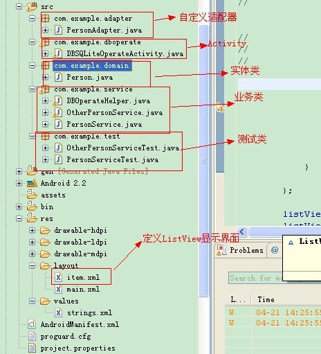 七、DBSQLiteOperateActivity.java Activity类的源码:package com.example.dboperate;import java.util.ArrayList;import java.util.HashMap;import java.util.List;import java.util.Map;import com.example.adapter.PersonAdapter;import com.example.domain.Person;import com.example.service.PersonService;import android.app.Activity;import android.database.Cursor;import android.os.Bundle;import android.view.View;import android.view.View.OnClickListener;import android.widget.AdapterView;import android.widget.AdapterView.OnItemClickListener;import android.widget.ListView;import android.widget.SimpleAdapter;import android.widget.SimpleCursorAdapter;import android.widget.Toast;public class DBSQLiteOperateActivity extends Activity { ListView listView; PersonService personService; OnItemClickListener listViewListener;/** Called when the activity is first created. */@Overridepublic void onCreate(Bundle savedInstanceState) {super.onCreate(savedInstanceState);setContentView(R.layout.main);listViewListener = new OnItemClickListener(){@Overridepublic void onItemClick(AdapterView<?> parent, View view, int position, long id) {//得到listView控件ListView listView = (ListView)parent;//1、如果使用自定义适配器,返回的是Person对象//得到该条目数据//Person person = (Person)listView.getItemAtPosition(position);////广播出去//Toast.makeText(getApplicationContext(), person.toString(), Toast.LENGTH_LONG).show();//2、如果使用showList2()方法中的适配器时,则取得的值是不一样的,返回的是cursor//Cursor cursor = (Cursor)listView.getItemAtPosition(position);//int personid = cursor.getInt(cursor.getColumnIndex("_id"));//Toast.makeText(getApplicationContext(), personid+"", Toast.LENGTH_LONG).show();//3、如果使用showList()方法中的适配器时,则取得的值是不一样的,返回的是map@SuppressWarnings("unchecked")Map<String,Object> map = (Map)listView.getItemAtPosition(position);String name = map.get("name").toString();String personid = map.get("personid").toString();Toast.makeText(getApplicationContext(), personid +"-"+ name, Toast.LENGTH_LONG).show();}};listView = (ListView) this.findViewById(R.id.listView);listView.setOnItemClickListener(listViewListener);personService = new PersonService(this);showList();} private void showList() { List<Person> persons = personService.getScrollData(0, 50); List<HashMap<String,Object>> data = new ArrayList<HashMap<String,Object>>(); for(Person person : persons){HashMap<String,Object> item = new HashMap<String,Object>();item.put("name", person.getName());item.put("phone", person.getPhone());item.put("amount", person.getAmount());item.put("personid", person.getId());data.add(item); } SimpleAdapter adapter = new SimpleAdapter(this,data,R.layout.item, new String[]{"name","phone","amount"}, new int[]{R.id.name,R.id.phone,R.id.amount}); listView.setAdapter(adapter); } public void showList2(){ Cursor cursor = personService.getCursorScrollData(0, 50); //该适配器要求返回的结果集cursor必须包含_id字段,所以需要对取得结果集进行处理 SimpleCursorAdapter adapter = new SimpleCursorAdapter(this,R.layout.item,cursor,new String[]{"name","phone","amount"}, new int[]{R.id.name,R.id.phone,R.id.amount} ); listView.setAdapter(adapter); } /** * 自定义适配器 */ public void showList3(){ List<Person> persons = personService.getScrollData(0, 50); /*** 第一个参数:上下文context,第二个参数:要显示的数据,第三个参数:绑定的条目界面*/ PersonAdapter adapter = new PersonAdapter(this, persons, R.layout.item); listView.setAdapter(adapter); }}八、person.java 实体类 源码:package com.example.domain;public class Person { private Integer id; private String name; private String phone; private Integer amount; public Integer getId() { return id; } public void setId(Integer id) { this.id = id; } public String getName() { return name; } public void setName(String name) { this.name = name; } public String getPhone() { return phone; } public void setPhone(String phone) { this.phone = phone; } public Person(String name, String phone) { this.name = name; this.phone = phone; } public Person(Integer id, String name, String phone,Integer amount) { super(); this.id = id; this.name = name; this.phone = phone; this.amount = amount; } public Person() { super(); } public Integer getAmount() { return amount; } public void setAmount(Integer amount) { this.amount = amount; } @Override public String toString() { return "Person [id=" + id + ", name=" + name + ", phone=" + phone+ ", amount=" + amount + "]"; }}九、DBOperateHelper.java 业务类源码:package com.example.service;import android.content.Context;import android.database.sqlite.SQLiteDatabase;import android.database.sqlite.SQLiteDatabase.CursorFactory;import android.database.sqlite.SQLiteOpenHelper;public class DBOperateHelper extends SQLiteOpenHelper { public DBOperateHelper(Context context) {//默认创建的数据库文件保存在<包名>/database/ //第一个参数是上下文,第二个参数是数据库名称,第三个是游标工厂为null时使用 数据库默认的游标工厂,第四个是数据库版本号但是不能为0,一般大于0 super(context, "smallpig", null, 4); } /** * 数据库每一次被创建时被调用 */ @Override public void onCreate(SQLiteDatabase sqldb) { sqldb.execSQL("create table person(personid integer primary key autoincrement,name varchar(20),phone varchar(12) null)"); }/** * 每一次数据库版本号发生变动时触发此方法 * 比如如果想往数据库中再插入一些表、字段或者其他信息时通过修改数据库版本号来触发此方法 */ @Override public void onUpgrade(SQLiteDatabase db, int oldVersion, int newVersion) { //db.execSQL("alter table person add phone varchar(12) null"); db.execSQL("alter table person add amount Integer null"); }}十、PersonService.java 业务类源码:package com.example.service;import java.util.ArrayList;import java.util.List;import android.content.Context;import android