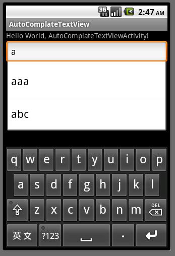 @Overridepublic void onCreate(Bundle savedInstanceState) {super.onCreate(savedInstanceState);setContentView(R.layout.main);AutoCompleteAdatercursorAdapter = new AutoCompleteAdater(this, android.R.layout.simple_dropdown_item_1line,null, DBHelper.NAME, android.R.id.text1);// 设置输入一个字符就弹出提示列表(默认输入两个字符时才弹出提示)((AutoCompleteTextView) this.findViewById(R.id.autoCompleteTextView1)).setThreshold(1);((AutoCompleteTextView) this.findViewById(R.id.autoCompleteTextView1)).setAdapter(cursorAdapter);}