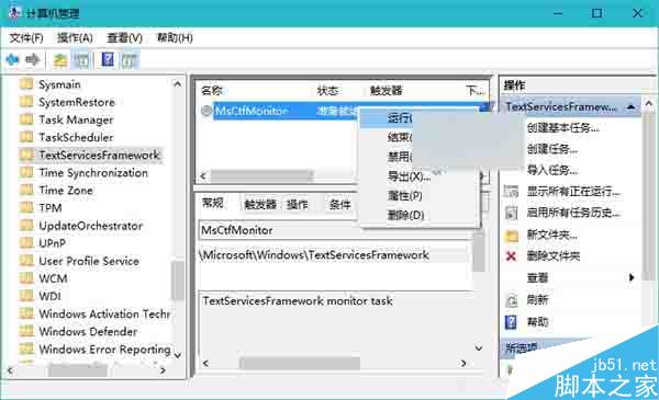 2、在计算机管理的系统工具——任务计划程序——任务计划程序库——Microsoft——Windows中找到TextServicesFramework,如下图所示,在右侧可以看到名为MsCtfMonitor的任务计划程序,右键单击MsCtfMonitor,选择“运行”即可。