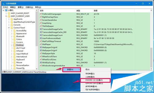 5、再在Desktop对应的右侧窗口,右键点击空白处 - 新建 - DWDRO(32位)值;
