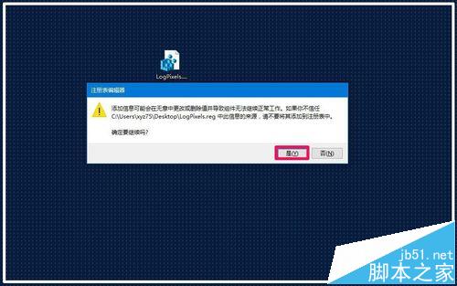 添加信息可能会在无意中更改或删除值并导致组件无法继续正常工作。如果你不信任 C:Usersxyz75DesktopLogPixels.reg 中此信息的来源,请不要将其添加到注册表中。确定要继续吗?点击:是(Y);