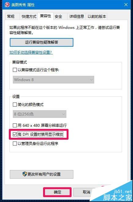 11、在打开的美图秀秀 属性窗口,点击【兼容性】,在设置项下有一个【高DPI设置时禁用显示缩放】,系统默认没有打勾;