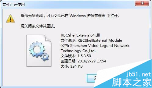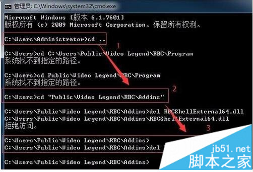3、这是因为RBCShellExternal64.dll跟explorer.exe绑定了,所以要先结束explorer.exe进程,运行cmd,打开到C:UsersPublicVideo LegendRBCAddins路径,输入del RBCShellExternal64.dll 先不回车,第二步结束explorer.exe进程,第三步回车,发现被删除了(当然可以直接结束explorer.exe,然后打开那个文件夹直接删除应该也是可以的,这个没测试);