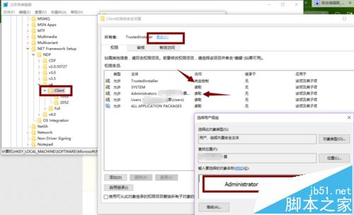 4、此Administrator管理员帐户只有只读权限,没有完全控制权限,是无法对注册表更改的,所以,这时点 ‘高级’ 在弹出的窗口上部,可以看到所有者是trustedinstaller,所以必须要将其改成administrators. 点右边的 更改,在弹出的窗口中输入administrators点确定再看所有者就成了administrators了,返回权限窗口选择administrators 勾上完全控制 ,这时点应用就可成功获得完全控制权。