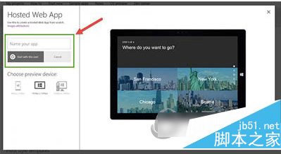 点击Hosted Web App,之后会弹出弹窗,在这里输入应用的名称,然后点击“Start with this one!”,在右侧会显示在不同设备中的预览。