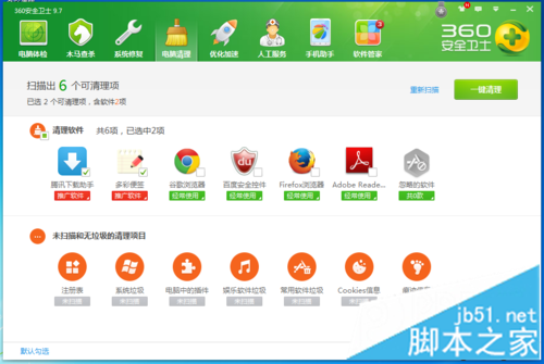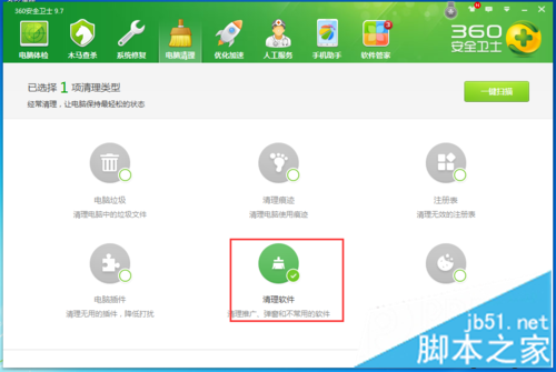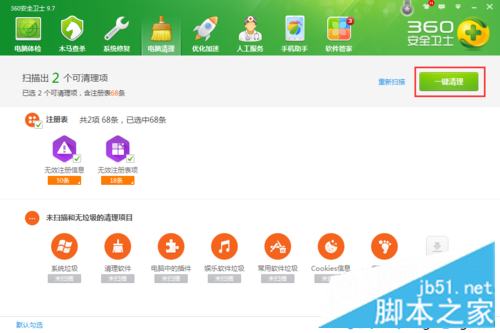 2、点击“电脑清理”,选中“注册表”,然后点击“一键扫描”;