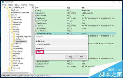 3、在WindowMetrics对应的右侧窗口,找到IconSpacing(图标间距),左键双击IconSpacing打开编辑字符串对话框,IconSpacing的系统默认值为-1125;