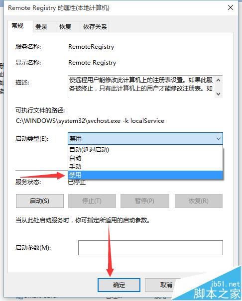 4、在弹出的话框里,在启动类型的下拉三角中选择禁用,然后点击确定就好了。