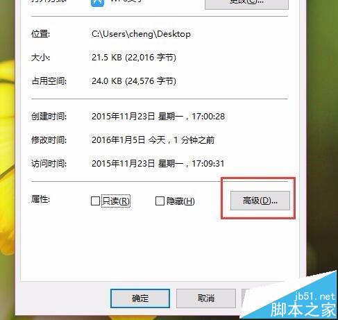 2、在文件或者文件夹属性页面中,点击首个选项卡中的“高级”菜单按钮,点击进入文件夹高级菜单属性页面。