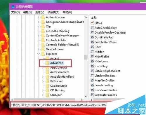 2、接下来,我们双击打开注册表左侧页面,依次双击左侧的子栏目,将注册表项定位至以下子项:HKEY_CURRENT_USERSoftwareMicrosoftWindowsCurrentVersionExplorerAdvanced