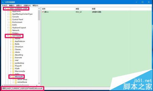 3、在打开的注册表编辑器窗口,依次展开:HKEY_CURRENT_USERSoftwareMicrosoft;