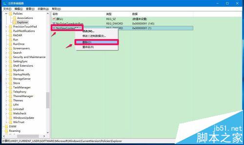 在Windows10系统的注册表中,HKEY_CURRENT_USERSoftwareMicrosoftWindowsCurrentVersionPoliciesExplorer中是没有NoViewContextMenu键值的,电脑中毒可能修改了注册表键值而引起鼠标故障,如果朋友们也遇到这个问题,可以在注册表编辑器中查看是否有NoViewContextMenu键值,有就删除而解决鼠标故障问题。
