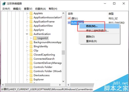 6、在“Buttonset”值上点击鼠标右键,在弹出的选线菜单中点击“修改(M)”选项。如图所示;
