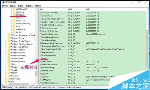 7、在Winlogon对应的右侧窗口,找到Shell项并左键双击:Shell;