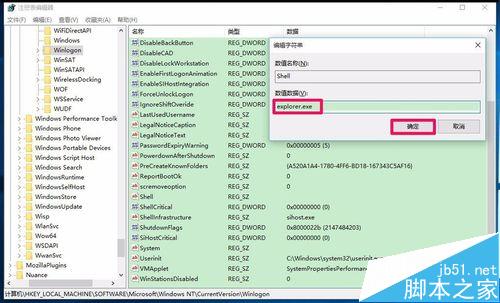 8、在打开的编辑字符串对话框中,把Shell的数值数据(V)设置为:explorer.exe(如果Shell的数值数据为explorer.exe,就不需要更改),再点击:确定;