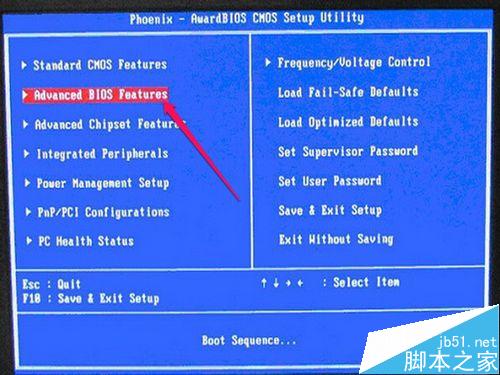 2、如果是老式的BIOS,也会有很多种,这里只介绍最普遍的一种,一般都是按Del或F2,F10,ESC等等进入BIOS,进入后,选择“Advanced BIOS Features”这一项,按Enter回车。