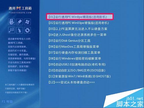 6、重启进入启动U盘后,在通用PE工具箱启动U盘中,选择“运行通用PE Win8pe精简版这一项”,老式机,选择PE Win03pe增强版这一项,即可进入PE。