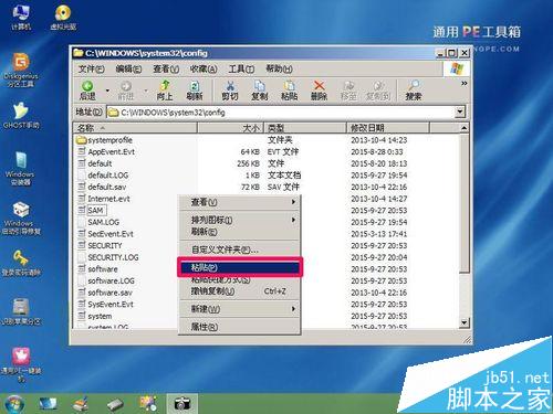 7、因为这个文件夹本来有个SAM文件,当粘贴时,会弹出提示,是否将现有的文件替换,按“是”即可,之所出现不能进入系统,就是因为这个文件损坏而引起的,所以必须替换它。然后退出PE,重启动电脑,就可以进入系统了。
