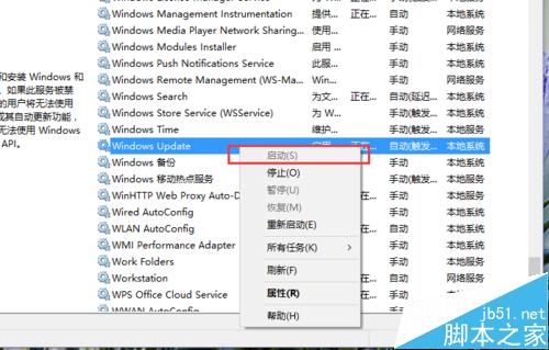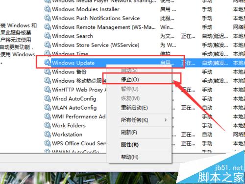 2、在Windows服务列表中,我们找到”Windows Update服务“,对着该服务击右键,然后选择”停止“按钮。