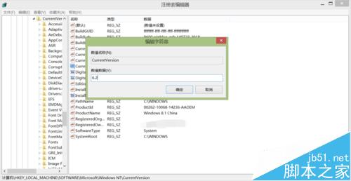 9、找到"HKEY_LOCAL_MACHINE/SOFTWARE/Microsoft/Windows NT/CurrentVersion",将数值从6.3改为6.2