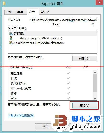 2、右键单击Explorer文件夹打开属性窗口,点击“安全”,然后在安全对话框中点击“高级”。