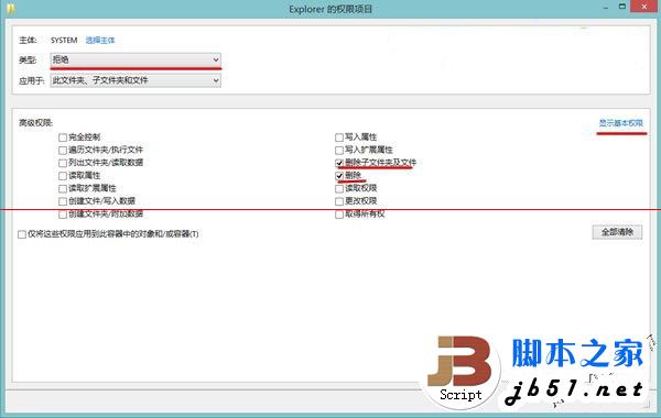 3、点击“添加” - “选择主体”,在文本框中输入SYSTEM得到SYSTEM的权限项目,点击“显示高级权限”,类型修改为“拒绝”,照下图中勾选高级权限,完成后点击“确定”。
