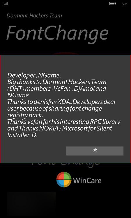 该应用程序仅适用于诺基亚/微软Lumia手机上。使用该应用说明:• 使用Windows Phone 8.1 SDK进行部署应用• 手机上运行字体更换应用• 点击选择字体按钮,选择任何.ttf字体。(经XDA更改,具体查看该地址。)如果你看到(NGame)或(NGame2)提示,说明已经完成。