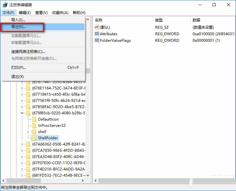 3、下面我们就可以修改{679f85cb-0220-4080-b29b-5540cc05aab6}ShellFolder的注册表键值,但在修改之前,备份一下注册表是必须的。