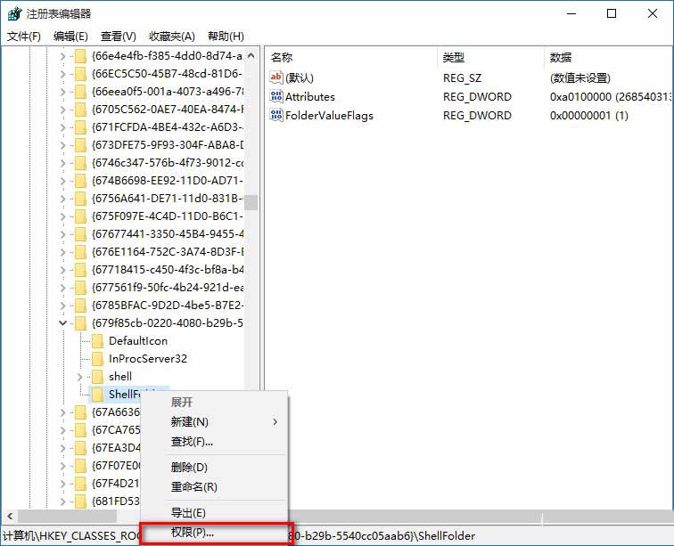 4、我们备份了{679f85cb-0220-4080-b29b-5540cc05aab6}ShellFolder的注册表键值,现在再来修改ShellFolder的权限值(不修改ShellFolder的权限值,则无法修改Attributes的键值),右键点击ShellFolder,在右键菜单中点击:权限;