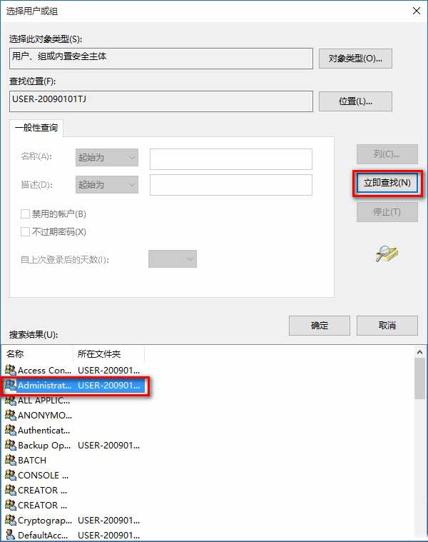 7、我们点击高级以后,选择用户或组的对话框有所变化,在这个对话框中点击:立即查找(N);在搜索结果(U)的列表中找到本机用户名并左键点击,再点击:确定;