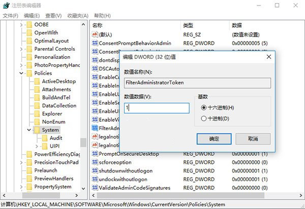 注意:若没有FilterAdministratorToken,则需要手动在右边空白处点击鼠标右键,新建 DWORD(32位)值,并更名为FilterAdministratorToken,将其数值数据改为1。