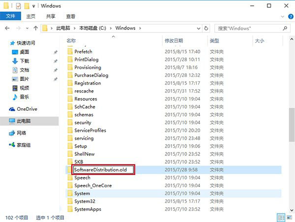 3、然后进入C:windows,找到SoftwareDistribution文件夹,并将其重命名为SoftwareDistribution.old(只要名称变了就行,不必非要是这个)