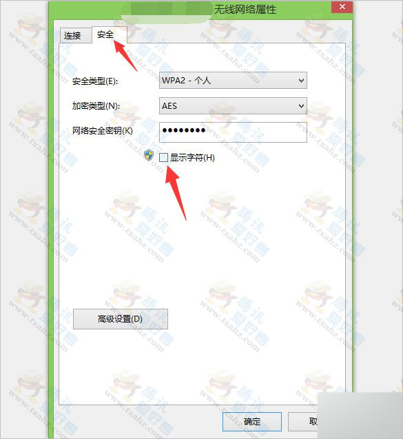 4、再点“安全”与“显示字符”即可查询到WIN8连接的WIFI密码