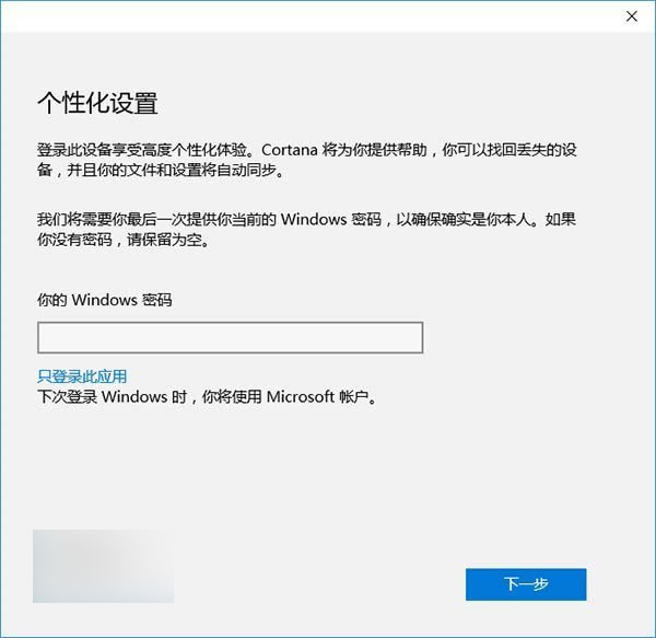 注:先别着急点击下一步,看到密码框下面的“只登录此应用”链接了没有?点击它就可以只在Windows应用商店中登录微软账户并下载应用了,而你的系统仍然可以继续使用本地账户登录。