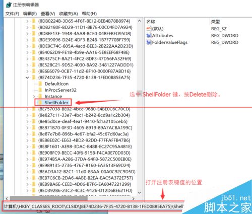 2、打开“注册表编辑器”后,在左侧的树形列表框里找到“HKEY_CLASSES_ROOTCLSID{8E74D236-7F35-4720-B138-1FED0B85EA75ShellFolder}”