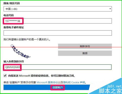 注册Micrososft帐号的信息填写完成,点击:创建帐户。