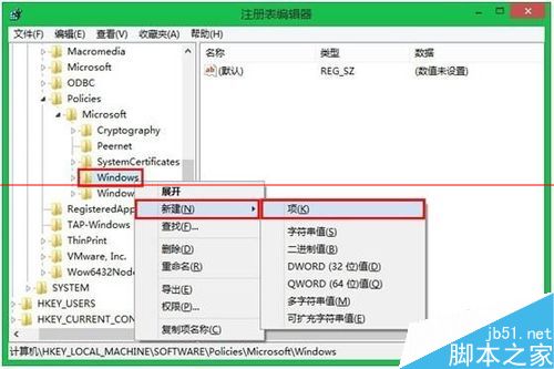 3、右键点击Windows文件夹,选择“新建”-“项”(Key),命名为Personalization;
