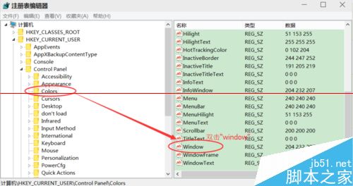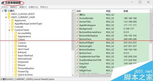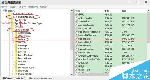 4、依次单击“HKEY_CURRENT_USER",再单击”Control Panel“,在下拉列表中单击”Colors“