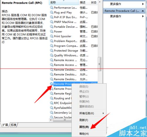 3、在右方服务列表中找到【Remote Procedure Call (RPC)】服务,右键点击选择【属性】