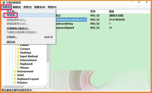 在Keyboard对应的右侧窗口,我们可以看到:InitialKeyboardIndicators,左键单击:InitialKeyboardIndicators,再点击左上角的文件 - 导出;